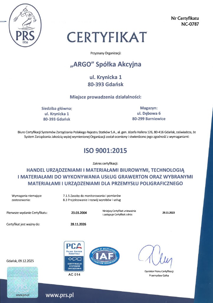 Skuteczność wdrożenia została potwierdzona uzyskaniem przez ARGO S.A. certyfikatu jakości, wydanego przez akredytowaną jednostkę certyfikującą – Polski Rejestr Statków.