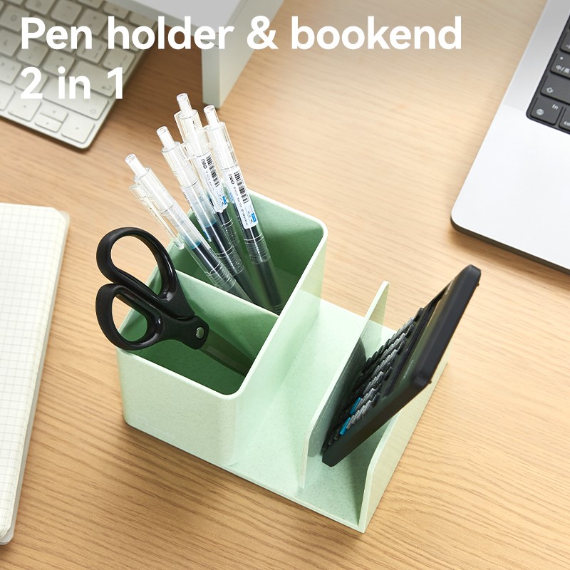 - organizer biurkowy 2 w 1 pełniący funkcję pojemnika na długopisy oraz podpórki na książki lub dokumenty
